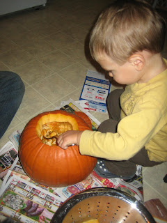 Our first family pumpkin carving experience was mostly a success. Zeke loves the pumpkin heads popping up around our neighborhood, so he seemed somewhat interested when I told him we would have one, too. He was fascinated with the knife, of course, and even helped with the design. His favorite part, though, was seeing it all lit up at the end.